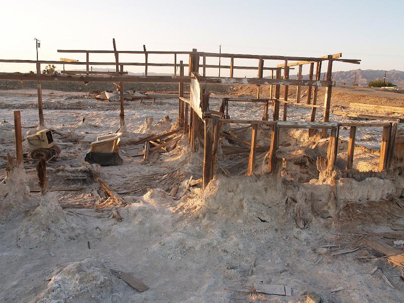 Salt creeps up the remaining wooden uprights of a building frame... and... a chair and TV??